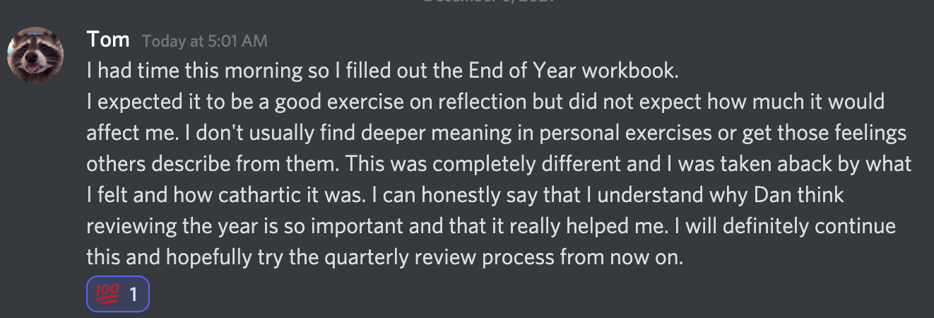 "Dan’s end of year review course was just what I needed to reflect back on this past year and take an in depth look at what I have accomplished and what patterns of behavior are present in my life that hold me back from getting where I want to go. He had us ask some very thought provoking questions which I would not otherwise stop to ask myself. His honesty about his own struggles while creating a system for measuring his progress toward reaching his goals makes him very relatable and enjoyable to learn from."